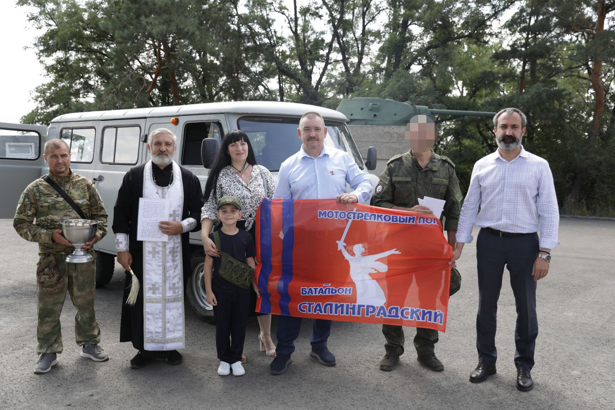 Перед отправкой груза иерей Владимир Пономаренко у храма Всех Святых на Мамаевом кургане отслужил молебен за здравие наших воинов. Священнослужитель сам часто бывает на передовой, доставляет гуманитарную помощь, медикаменты, посылки, собранные прихожанами, а также духовно окормляет наших бойцов и оказывает им необходимую поддержку.