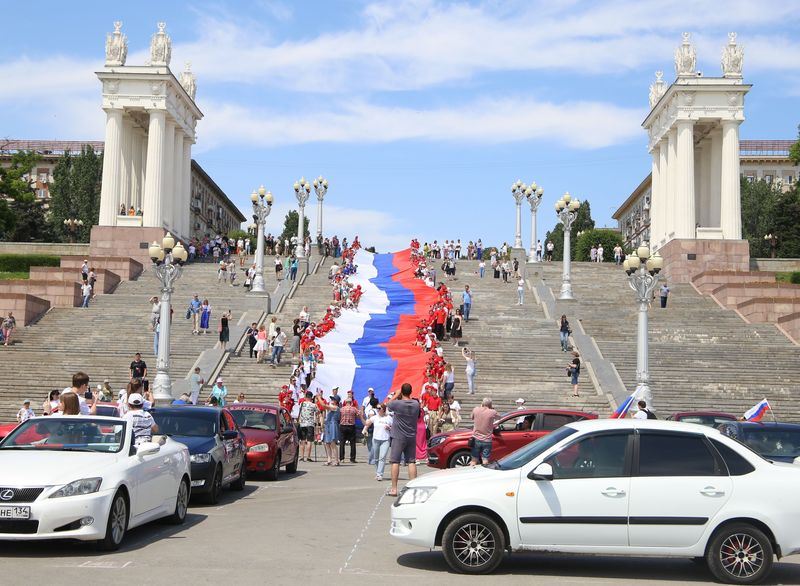 Когда автолюбители уже готовились к старту пробега, на центральной набережной Волгограда появился российский флаг. Молодежь города-героя пронесла 80-метровое полотнище от площади Павших Борцов до Нижней террасы, где развернула флаг под звуки государственного гимна. Активисты молодежных организаций и патриотических клубов, учащиеся образовательных учреждений приветствовали участников автопробега, который отъехали от набережной под звуки песни «Россия».
