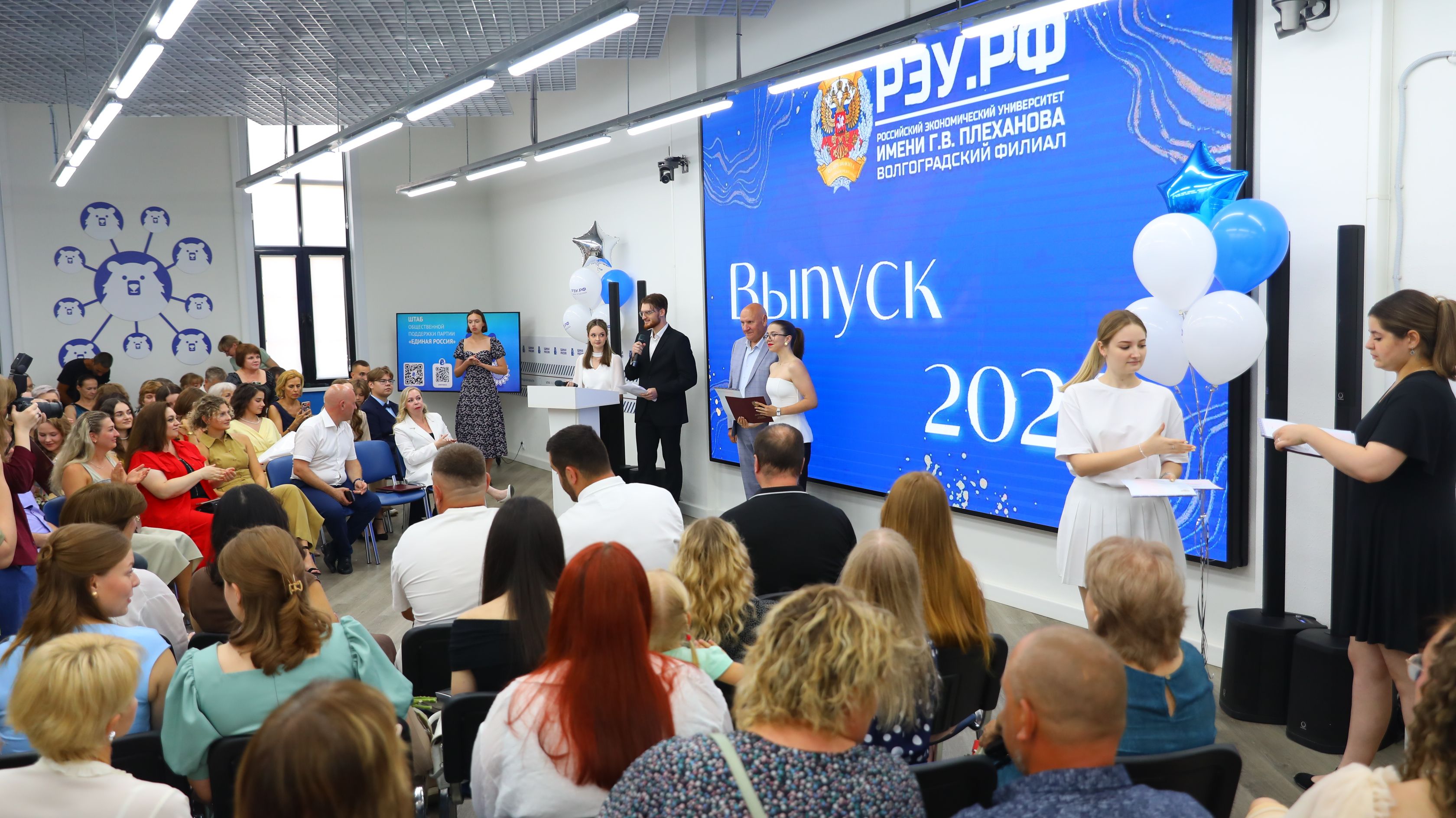 Торжественная церемония вручения дипломов 88 выпускникам Волгоградского филиала РЭУ им. Г.В. Плеханова прошла на площадке Штаба общественной поддержки. На мероприятии присутствовали родственники и преподаватели вчерашних студентов. С окончанием учебы молодых специалистов экономики и менеджмента поздравил первый заместитель председателя гордумы Дмитрий Дильман.