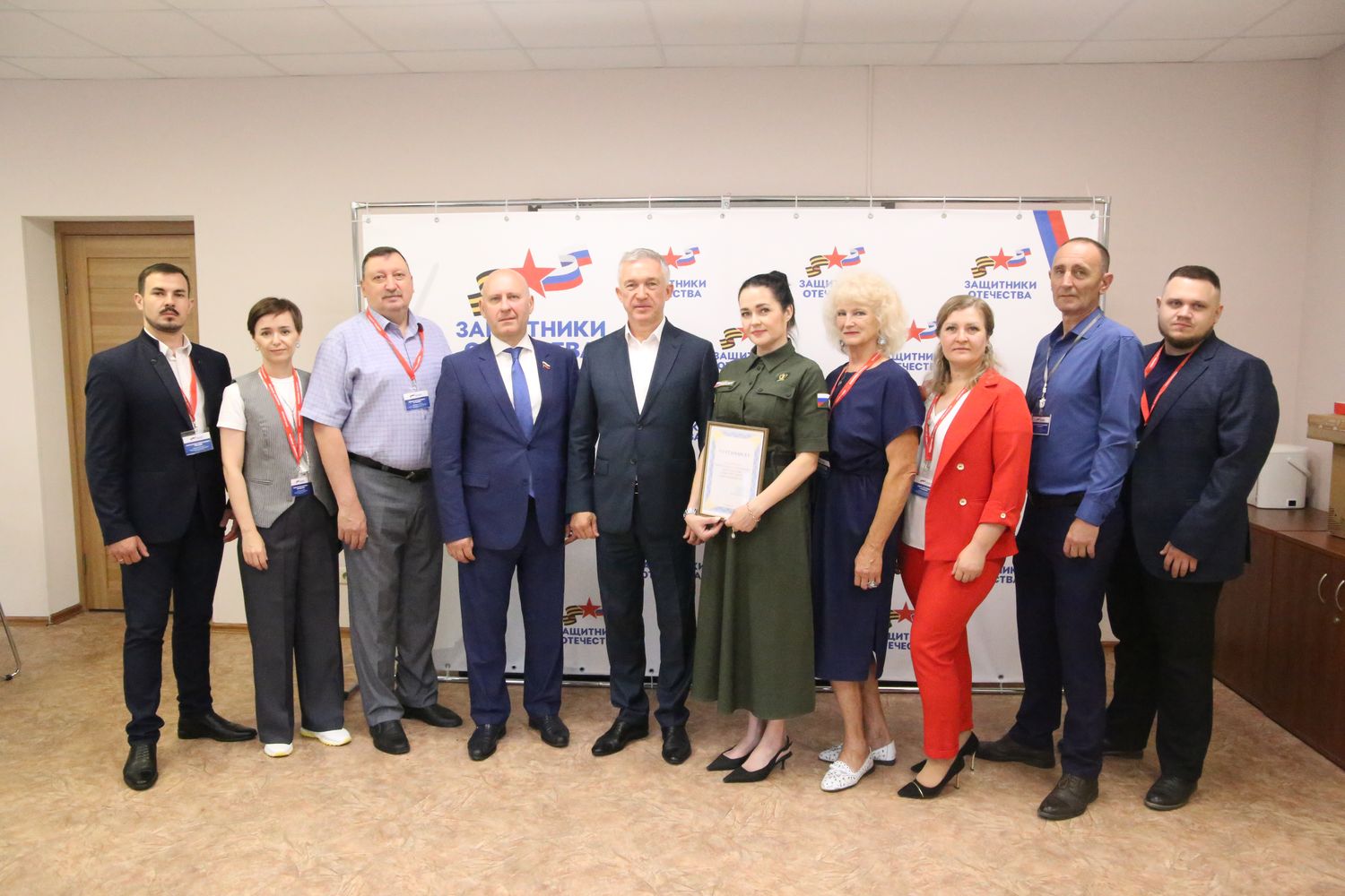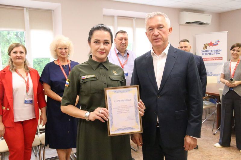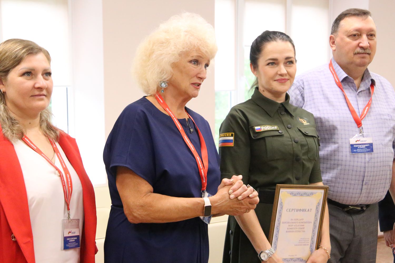 Сегодня председатель гордумы Владлен Колесников вручил руководителю регионального «Комитета семей воинов Отечества» Марине Фатеевой сертификат на передачу компьютера.