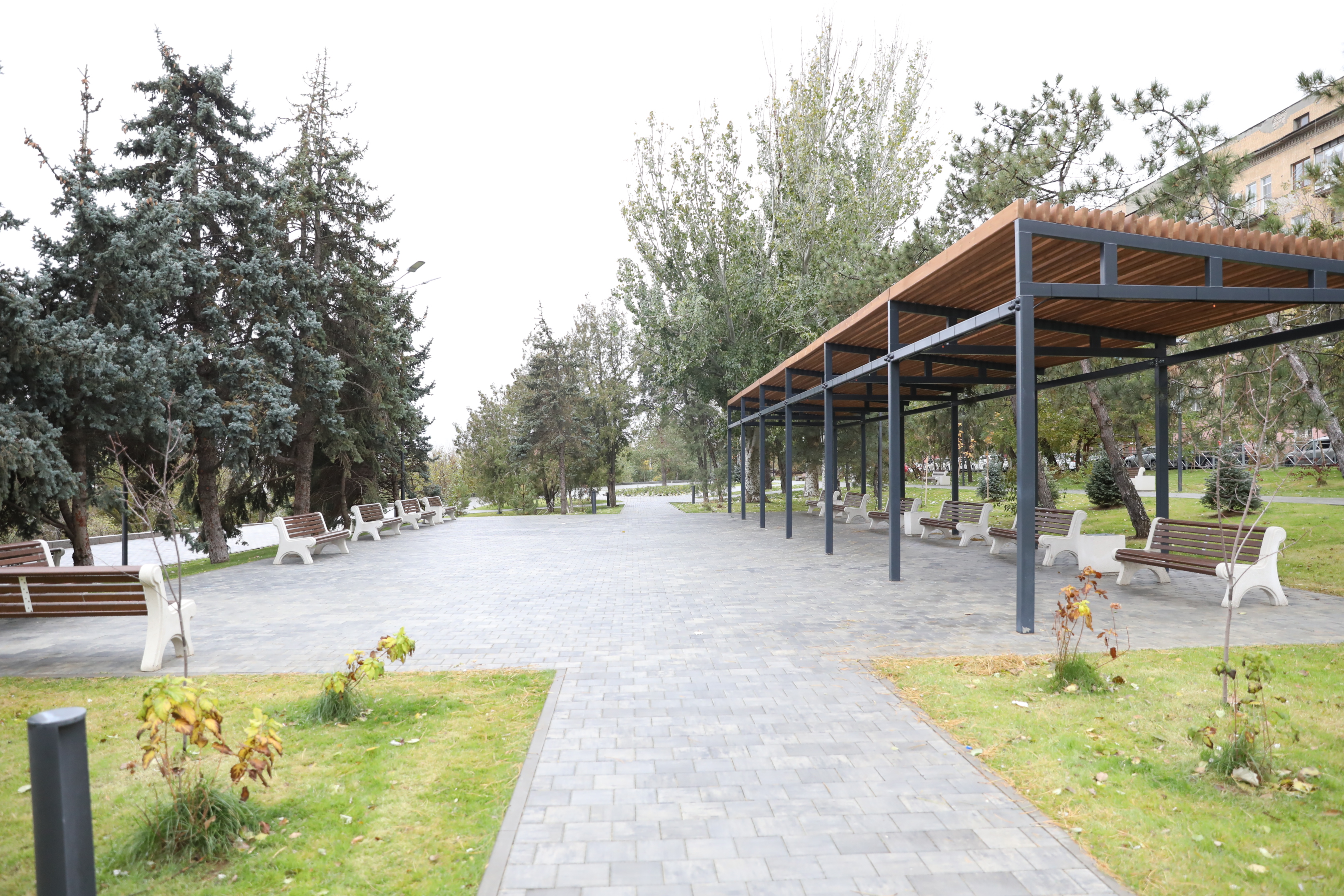 Приведены в порядок покрытие пешеходных зон, сделаны системы наружного освещения, видеонаблюдения, оповещения, поливочный водопровод, установлены малые архитектурные формы, детская игровая площадка с травмобезопасным покрытием, пергола, качели с навесом.