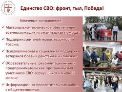 Эта деятельность характеризуется комплексным подходом. Депутатский корпус выступает не только как инициатор гуманитарных процессов, но и активно участвует в реализации спецпроектов, направленных на адаптацию ветеранов боевых действий к мирной жизни.