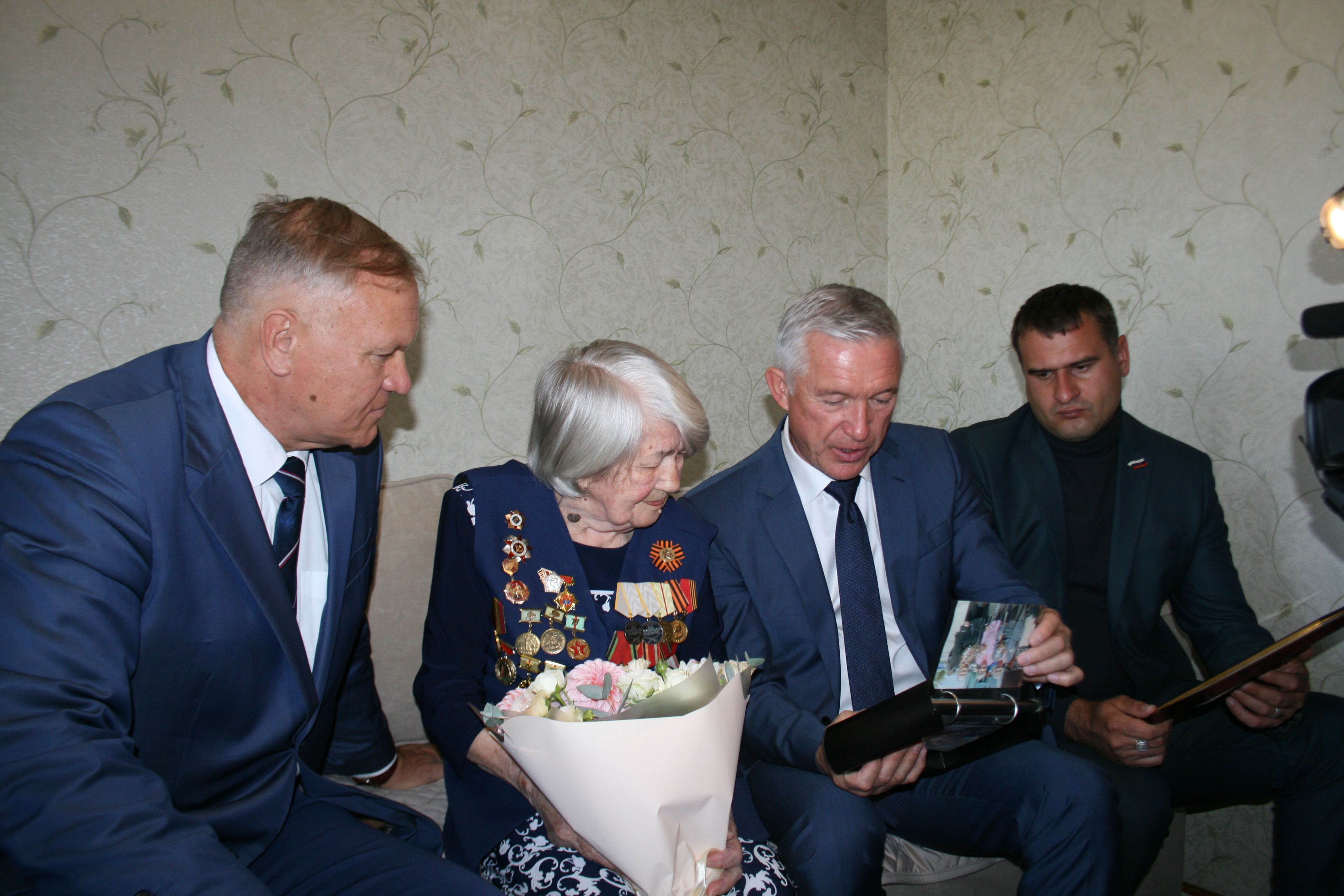 100-летний юбилей отметила на днях участница Сталинградской битвы Александра Семеновна Машкова. Вернувшийся накануне из Луганска спикер гордумы Владлен Колесников вместе с депутатами по Краснооктябрьскому району Владиславом Минаевым и Сергеем Берендеевым поздравили Александру Семеновну с большим юбилеем и передали ей, в том числе, подарки от жителей Донбасса, который она помогала освобождать в Великую Отечественную войну.