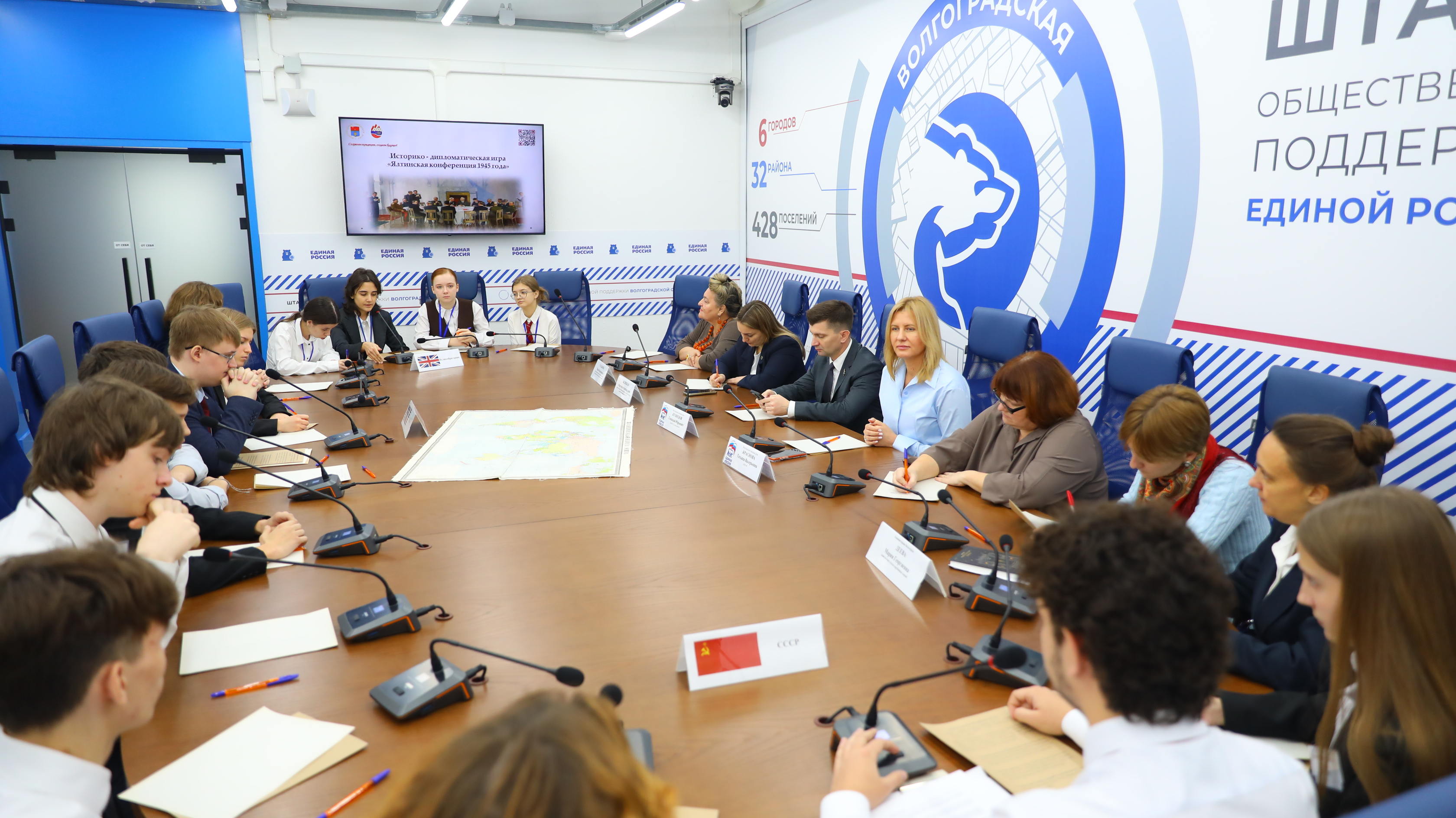 Городская историко-дипломатическая игра «Ялтинская конференция 1945 года» прошла сегодня в Волгограде. Школьникам предстояло воссоздать международную обстановку, сложившуюся на тот момент, продемонстрировать дипломатическую линию Советского Союза, США и Великобритании. При этом конференция не обязательно должна была стать точной копией событий 1945 года - игроки могли принимать решения под углом минувших 80-ти лет. Мирных переговоров пожелали «Большой Тройке» зампред Волгоградской городской Думы Геннадий Кузнецов и депутаты – директор ГДЮЦ Татьяна Минина, Михаил Покручин, Татьяна Краснова и Владислав Минаев.