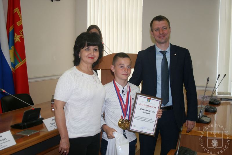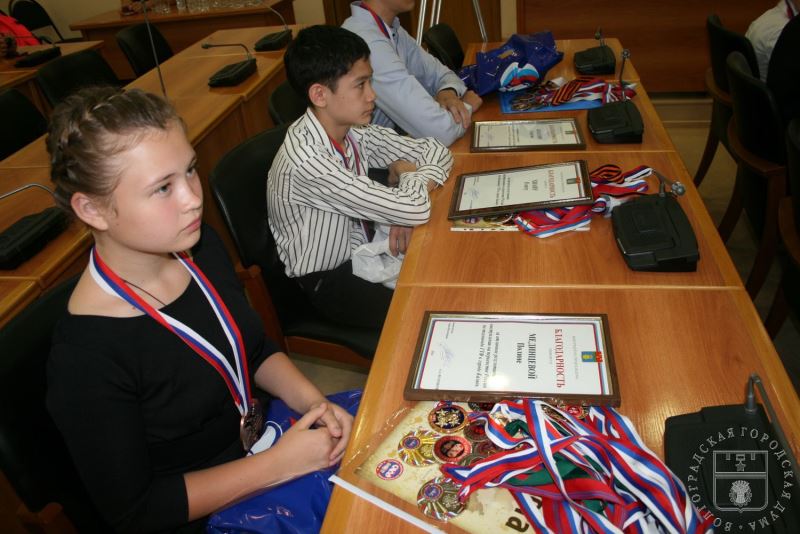 Члены сборной команды Волгограда по тхэквондо принимают поздравления от заместителя главы Волгограда Алексея Волоцкова и депутатов Волгоградской городской Думы