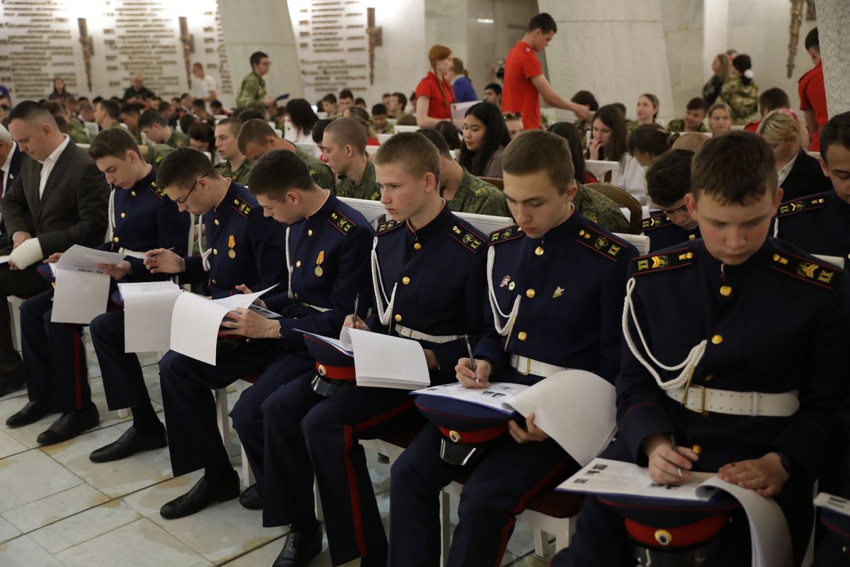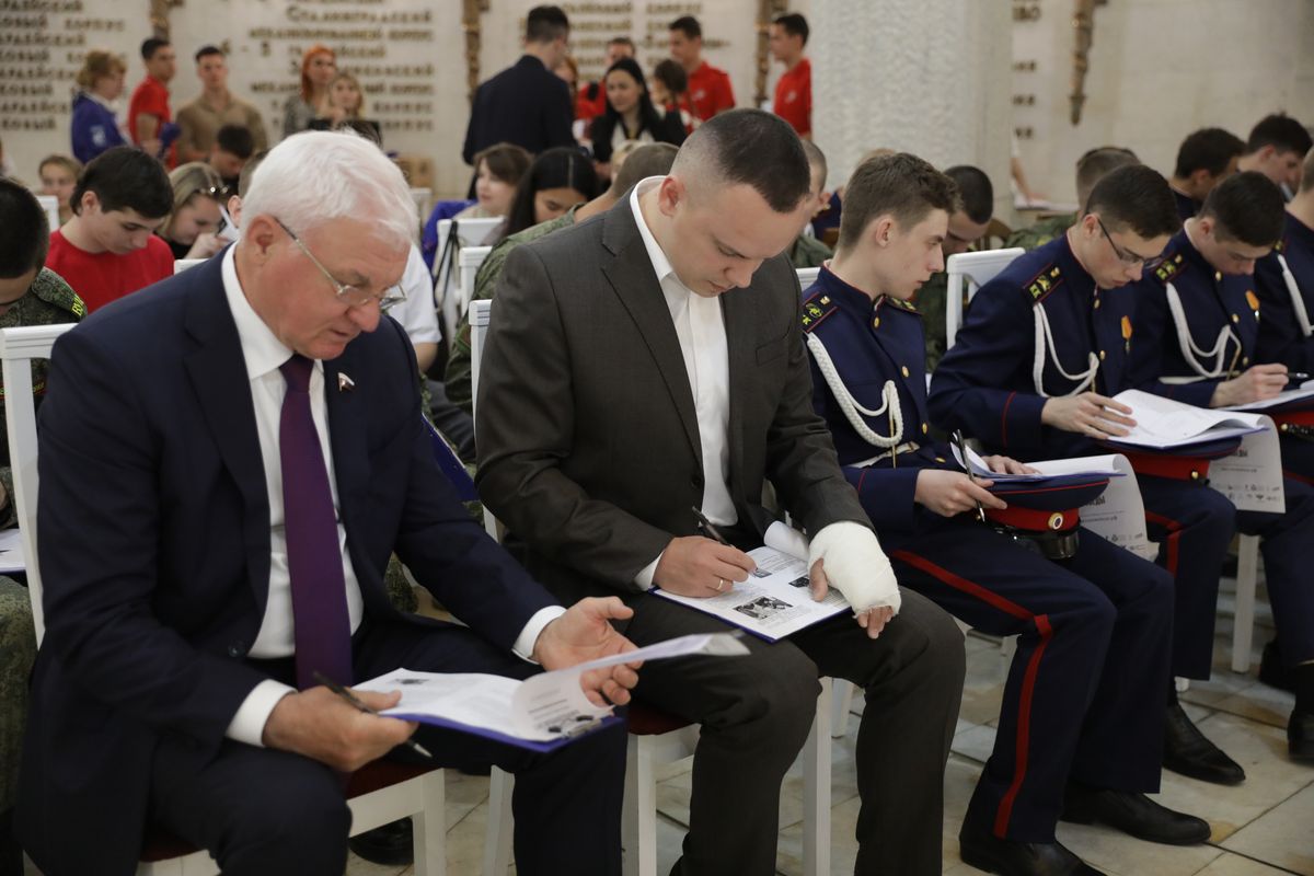 В Триумфальном зале музея-панорамы «Сталинградская битва» вместе с юнармейцами и волонтерами Победы «Диктант Победы» писали участники специальной военной операции, курсанты военной кафедры Аграрного университета, воспитанники Волгоградского кадетского корпуса имени Ф.Ф. Слипченко, депутаты Государственной Думы Андрей Гимбатов и Владимир Плотников, депутат областной Думы Игорь Воробьёв и депутат городской Думы Михаил Харитонин.