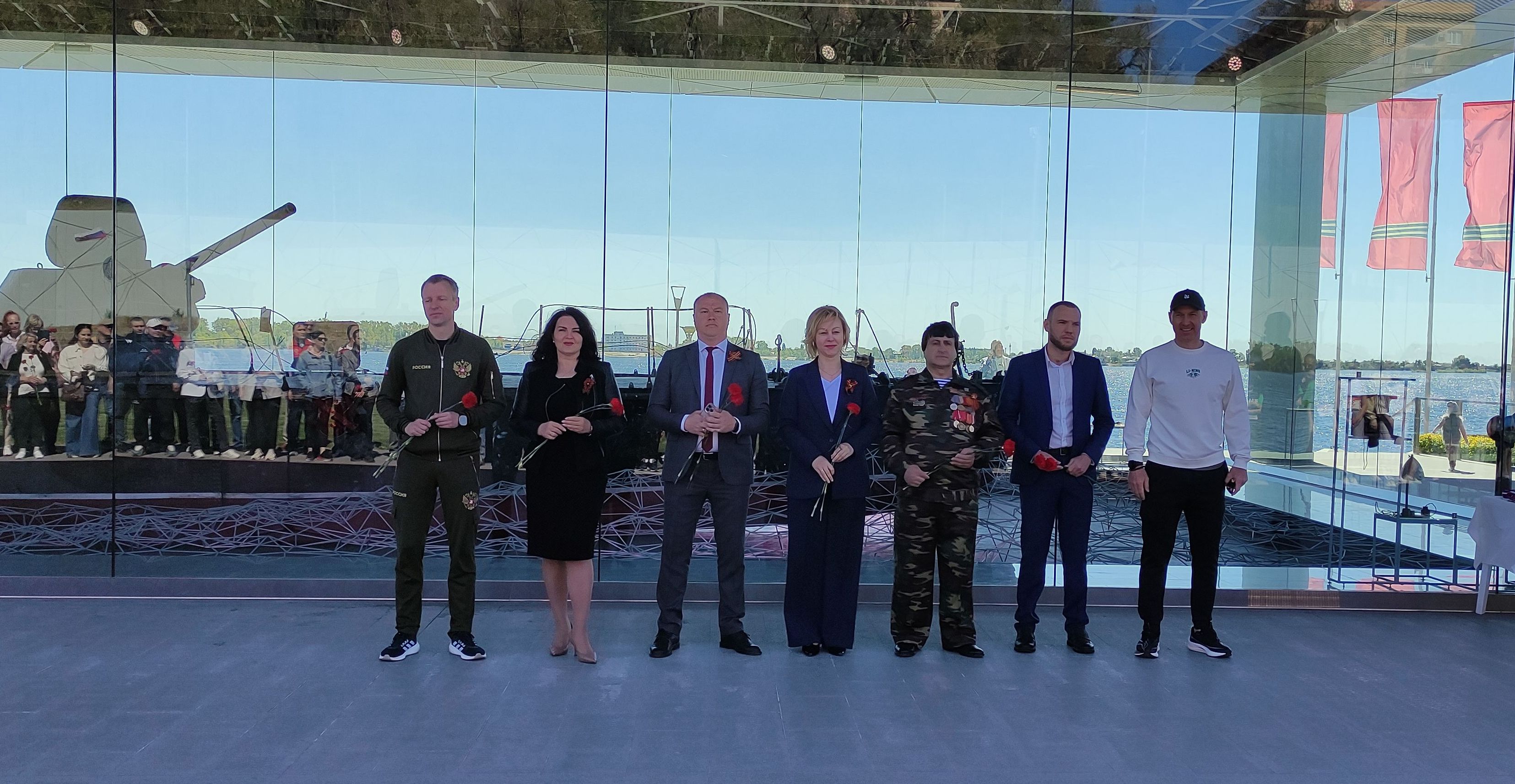 Перед стартом эстафеты собравшиеся почтили память погибших в Великой Отечественной войне минутой молчания и возложили венки и цветы к памятному знаку Героям Волжской Военной Флотилии на Центральной набережной.