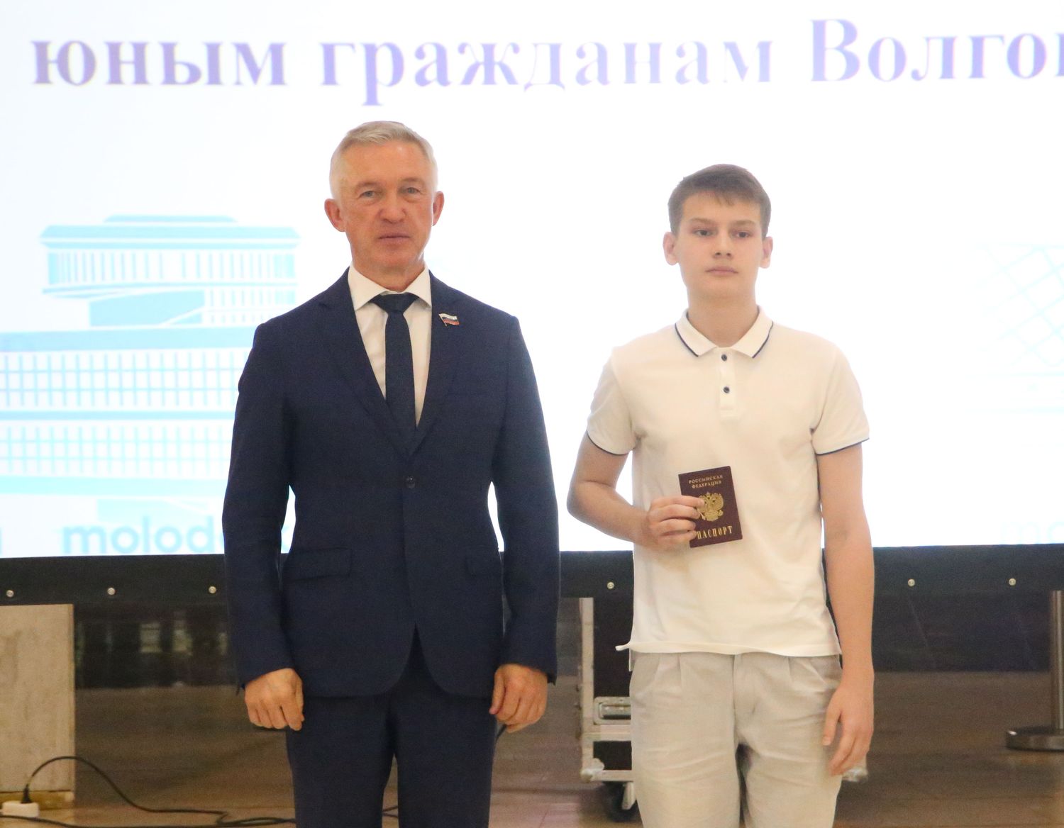 Первые в жизни паспорта им вручили председатель Волгоградской городской Думы Владлен Колесников и Почетный гражданин Волгограда, председатель городского Совета ветеранов Александр Струков.