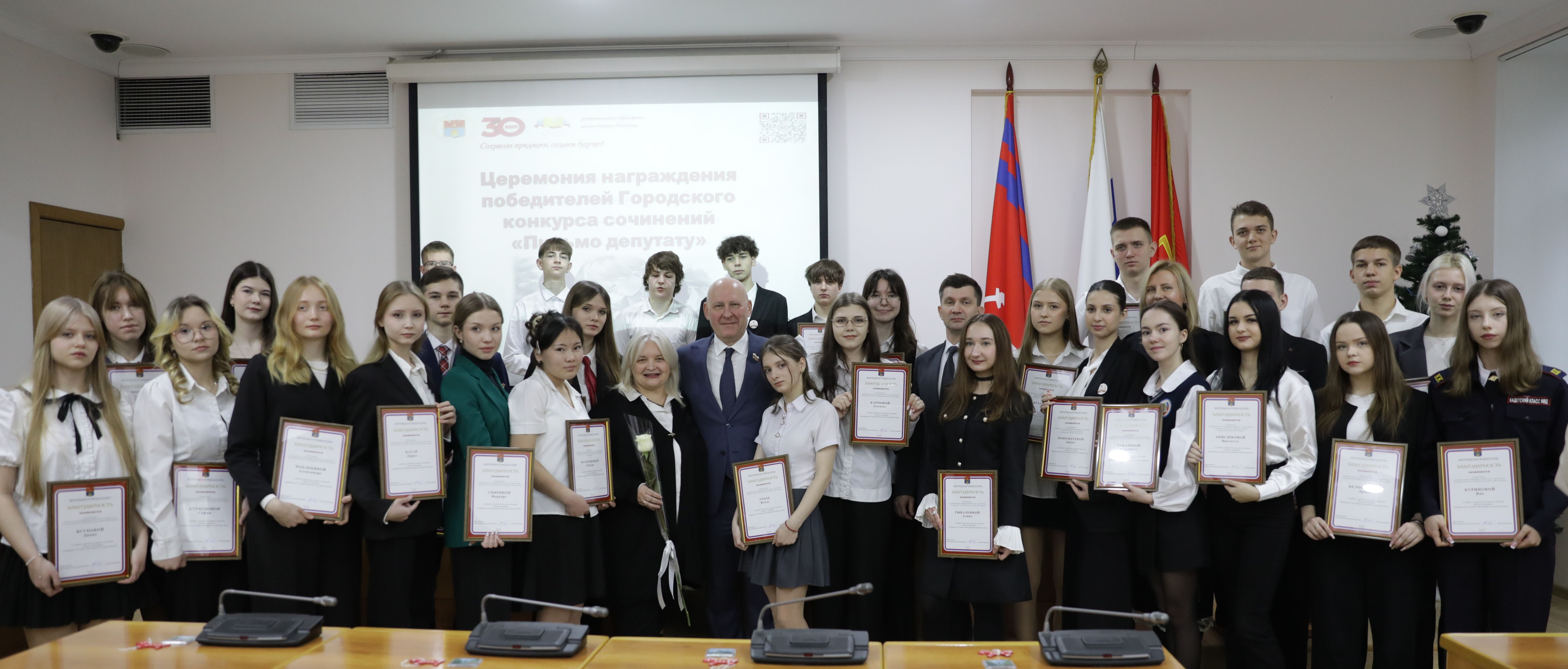 В Волгоградской городской Думе сегодня наградили победителей конкурса «Письмо депутату». Конкурс был посвящен 30-летию представительного органа: молодые волгоградцы вспоминали историю города, адаптировали ее к современности, формулировали задачи для гордумы будущего. Всего было представлено порядка ста работ – письма были адресованы депутатам прошлых лет, народным избранникам действующего созыва, а также тем, кто будет работать здесь в следующих созывах. Тридцать два победителя и их наставники стали участниками сегодняшнего торжества. Благодарность за любовь к родному городу, неравнодушие и интерес к истории ребятам выразили вице-спикеры Дмитрий Дильман и Геннадий Кузнецов, председатель думского комитета по образованию Лариса Тропкина, зампред комитета по муниципальному имуществу Татьяна Краснова и замруководителя департамента образования администрации города Светлана Пятаева.