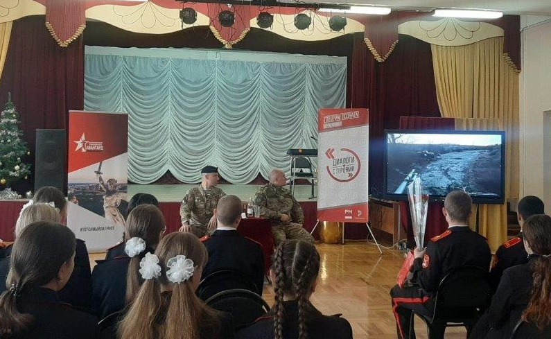 Встреча со старшеклассниками 54-й школы Волгограда началась с просмотра документального фильма про добровольческий отряд «Бессмертный Сталинград». Ребята смогли проникнуться атмосферой, которая царит среди наших бойцов на передовой, и в очередной раз убедились - герои сегодня находятся среди нас.