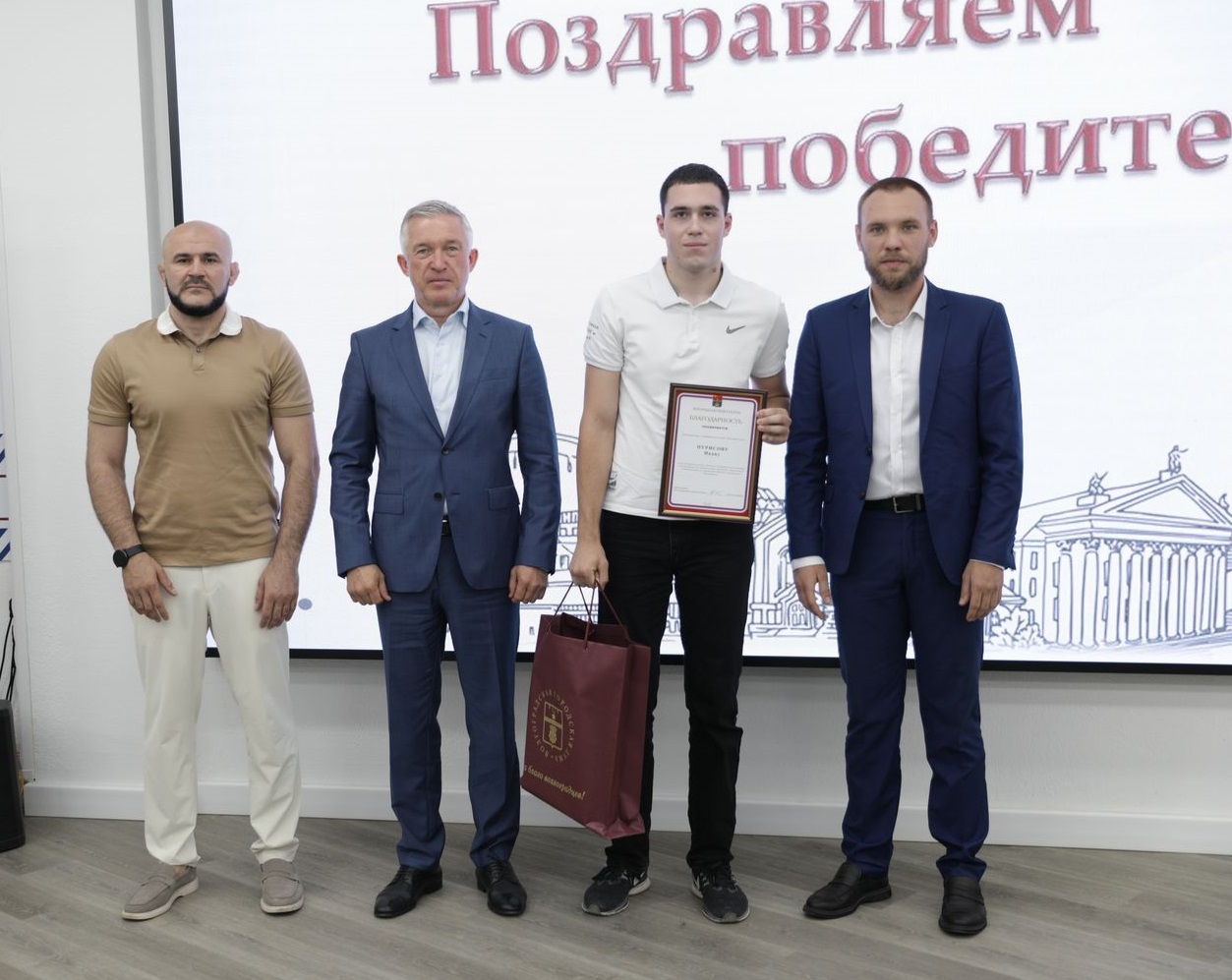 Также за вклад в развитие массовой физической культуры среди молодежи и высокий профессионализм Благодарностями Волгоградской городской Думы награждены директор учреждения допобразования «Быковский Дом творчества» Татьяна Нех, главный тренер Виктор Фазылжанов, главный тренер спортклуба «Высшая лига» Эйваз Гараев, старший тренер спортклуба «Самбо 34» Рауль Мухамбетов, главный тренер Федерации спортивной борьбы Волгоградской области в дисциплине панкратион Гасанали Гасаналиев, вице-президент Федерации спортивной борьбы Волгоградской области, президент Федерации панкратиона Волгоградской области Иван Селянкин.
