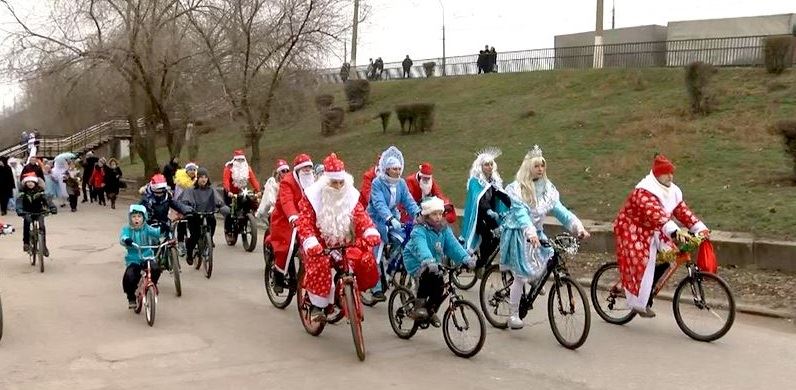 Несмотря на отсутствие снега, настроение на параде было по-настоящему новогодним. Количество Дедов Морозов и Снегурочек не поддавалось исчислению. А вот оленьи упряжки пришлось сменить на более традиционный в нашей климатической зоне транспорт – велосипеды и лошадей.