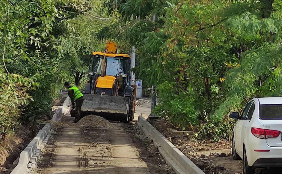 Как показала сегодняшняя инспекция, ремонт идет в хорошем темпе: уже убрана большая часть старого дорожного покрытия, сейчас рабочие укладывают бордюрный камень.
