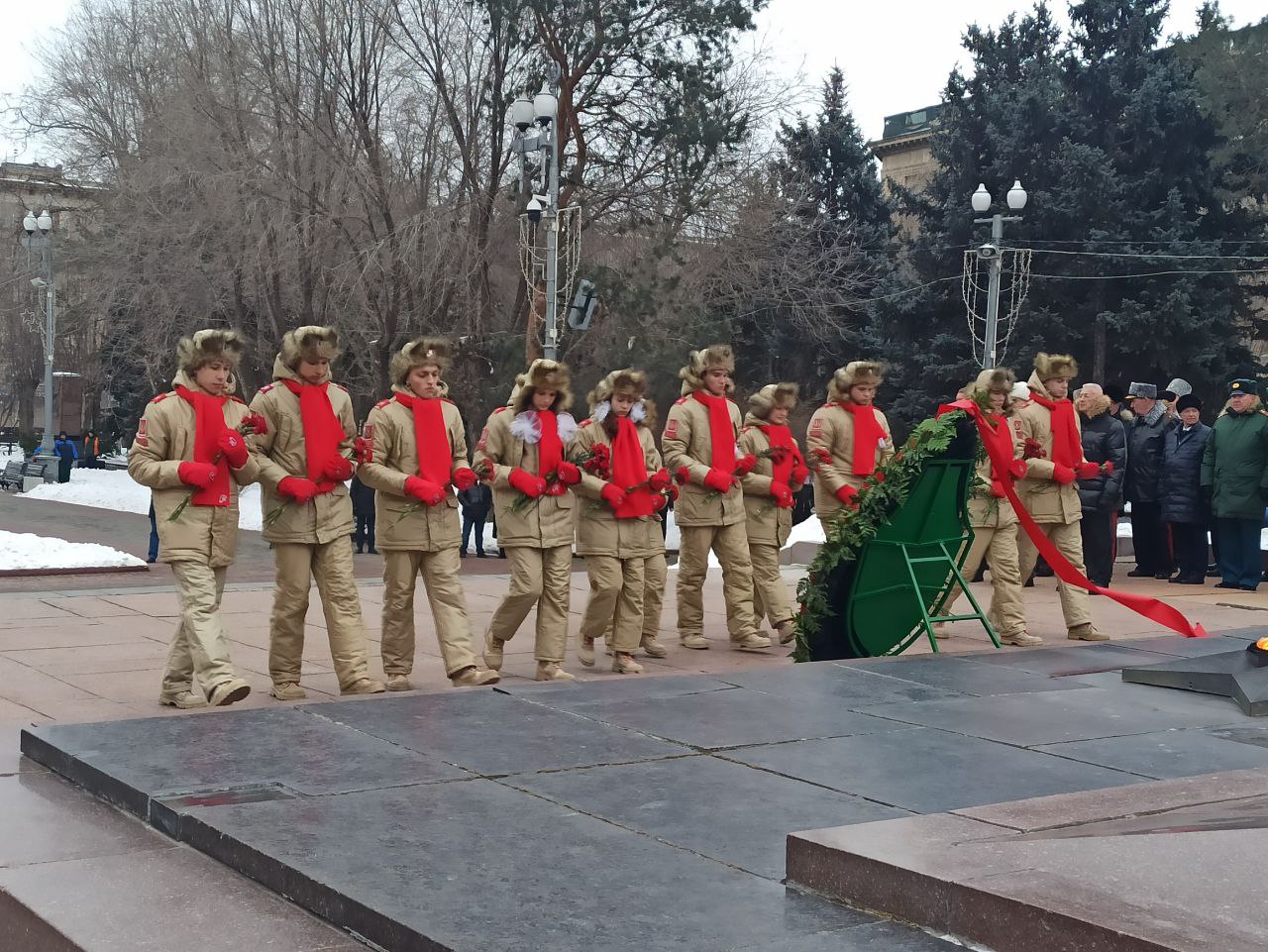 Мероприятия в честь Дня защитника Отечества начались сегодня с церемонии возложения цветов и венков к Вечному огню на Братской могиле защитников Красного Царицына и воинов 62-й и 64-й армий, погибших при защите Сталинграда.