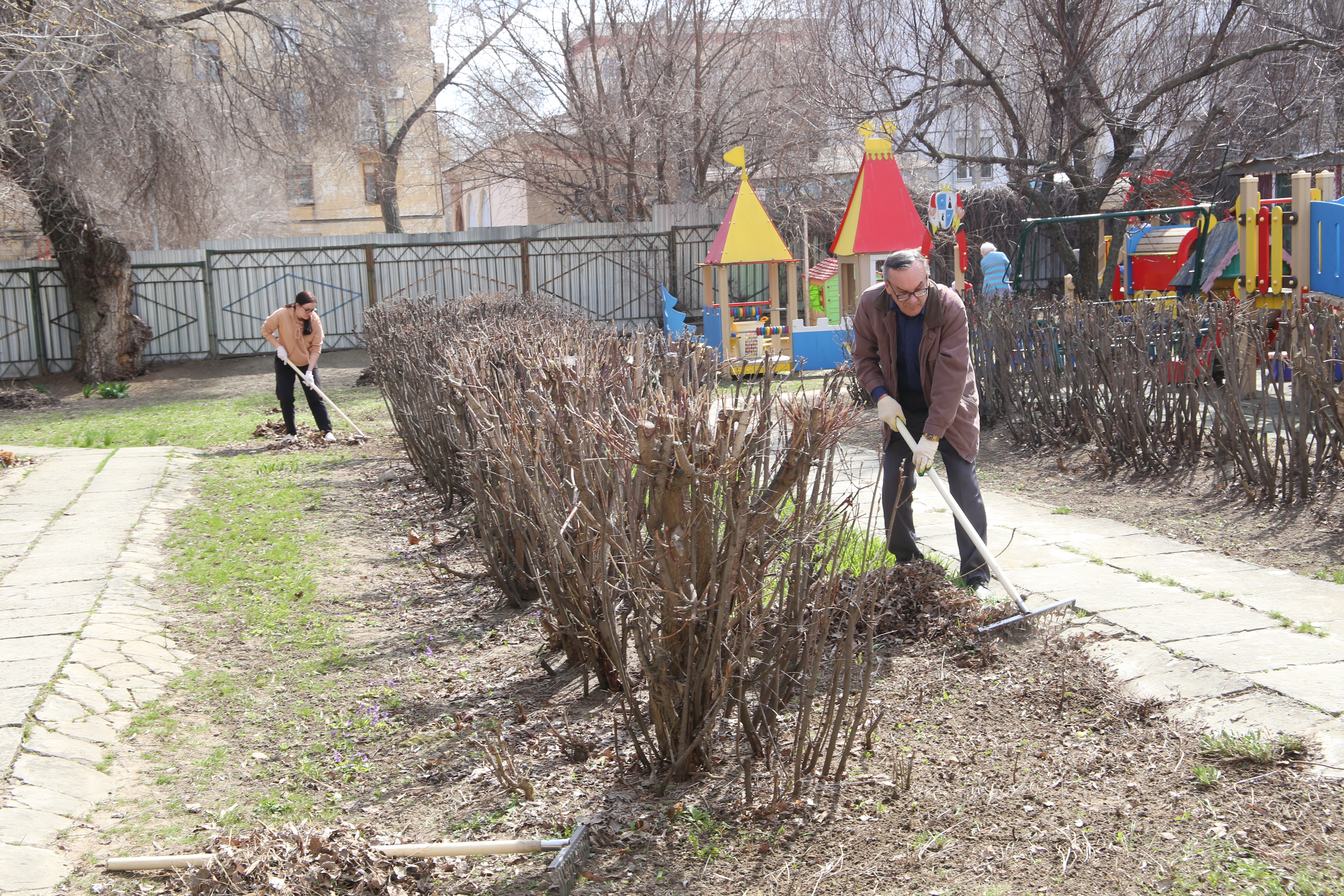 Председатель гордумы Владлен Колесников и сотрудники аппарата Думы общими усилиями очистили от прошлогодней листвы прогулочные площадки для детей и дворик с беседками и игровыми комплексами, покрасили бордюры, убрали упавшие с деревьев сухие ветки, почистили асфальтовые дорожки.