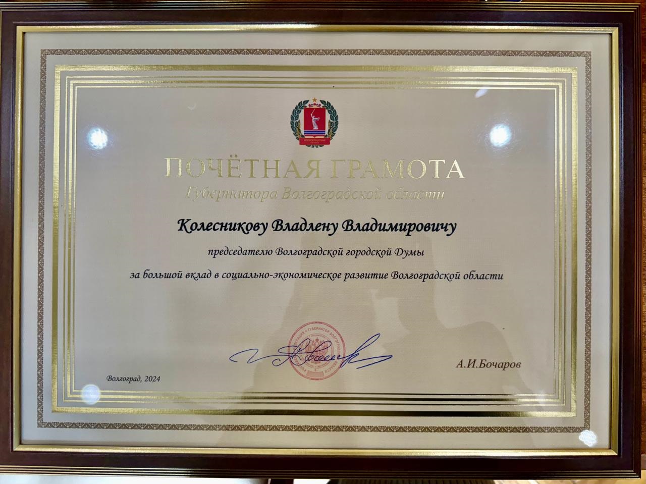 В администрации Волгоградской области в преддверии Дня местного самоуправления в России прошло торжественное мероприятие. Труд лучших работников муниципалитетов был отмечен региональными и федеральными наградами. Почетной грамотой Губернатора Волгоградской области награжден председатель Волгоградской городской Думы Владлен Колесников.