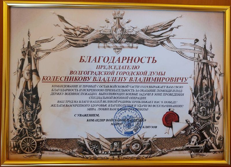 Председатель Волгоградской городской Думы Владлен Колесников получил благодарность от командования и личного состава 109-го отдельного инженерного саперного батальона 20-й гвардейской мотострелковой дивизии за большой вклад в обеспечение участников СВО необходимым оборудованием.