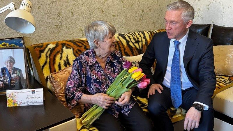 С наступающим весенним праздником поздравил сегодня председатель городской Думы Владлен Колесников замечательных женщин – участниц Сталинградской битвы Александру Семеновну Машкову и Валентину Федоровну Подлесную.