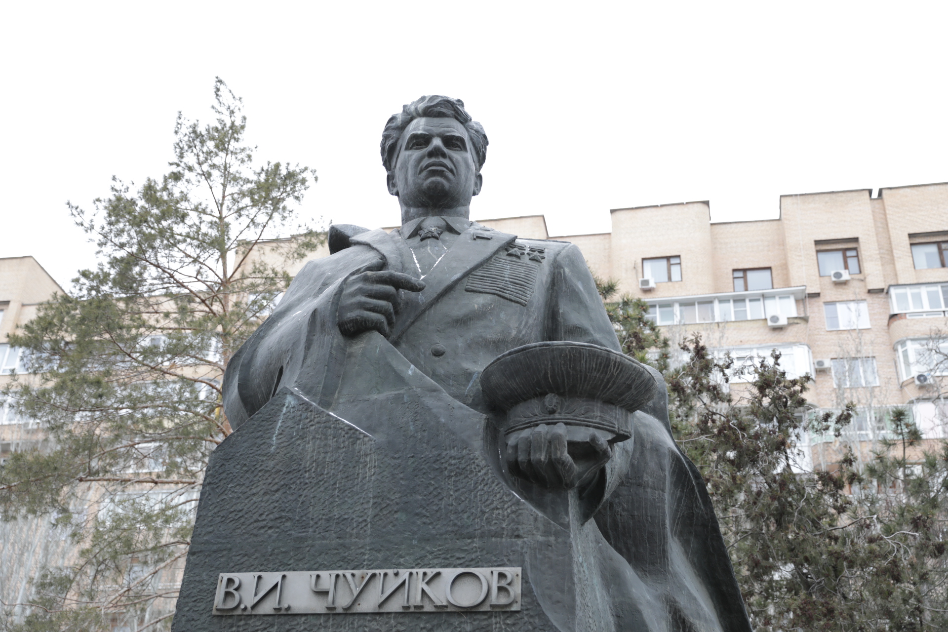 Памятник дважды Герою Советского Союза Василию Чуйкову спроектировал сын легендарного военачальника архитектор Александр Чуйков. Он был открыт в канун 45-й годовщины Великой Победы – 7 мая 1990 года на улице, носящей имя маршала Советского Союза. На постаменте памятника начертана цитата Василия Чуйкова: «Есть в огромной России город, которому отдано мое сердце... Он вошел в историю как Сталинград».