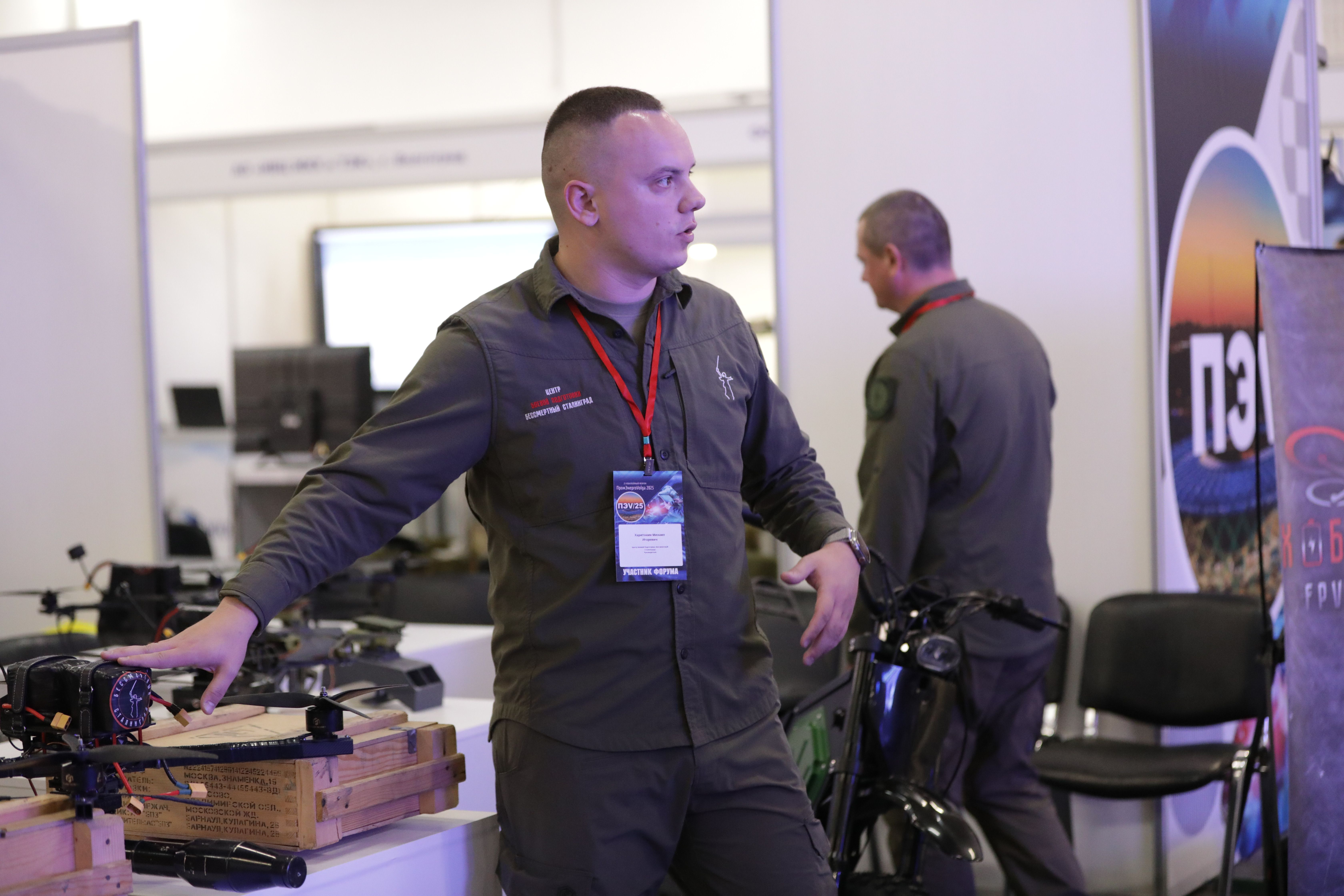 Стенд с новыми видами БПЛА и мототехникой, изготовленной в Волгоградской области, на выставочной площадке «Беспилотные авиационные системы» представляют совместно Центр боевой подготовки «Бессмертный Сталинград» и компания «Хобби 34». Посетителям выставки демонстрируются образцы восьми новейших беспилотников и два мощных электромотоцикла. О новинках рассказывает руководитель Центра, депутат Волгоградской городской Думы Михаил Харитонин.