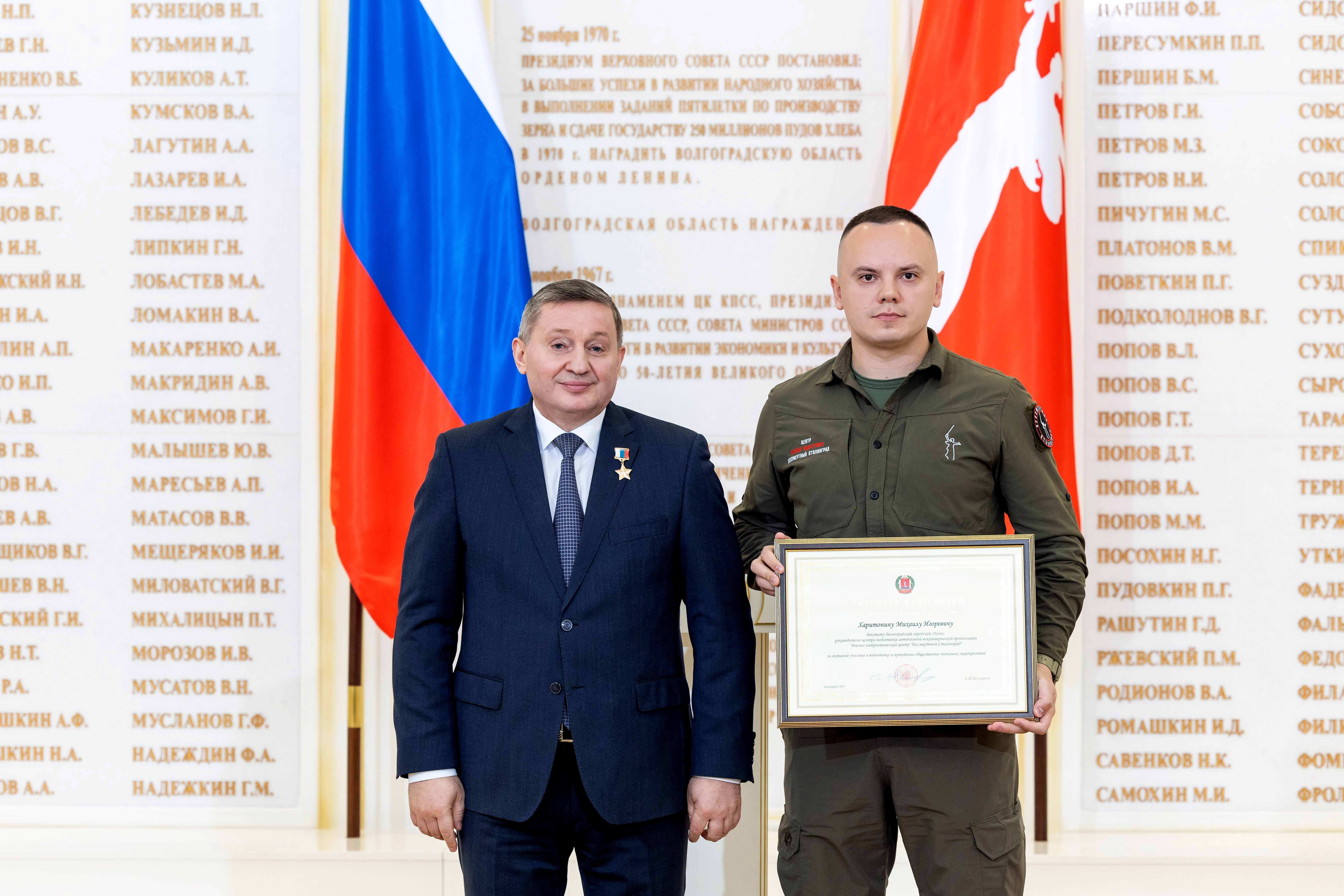 Среди награжденных — председатель Волгоградской городской Думы Владлен Колесников. Ему присуждена медаль ордена «За заслуги перед Волгоградской областью». За активное участие в подготовке и проведении общественно значимых мероприятий Почётной грамоты Губернатора Волгоградской области удостоен депутат Волгоградской городской Думы, руководитель Центра боевой подготовки "Бессмертный Сталинград" Михаил Харитонин.