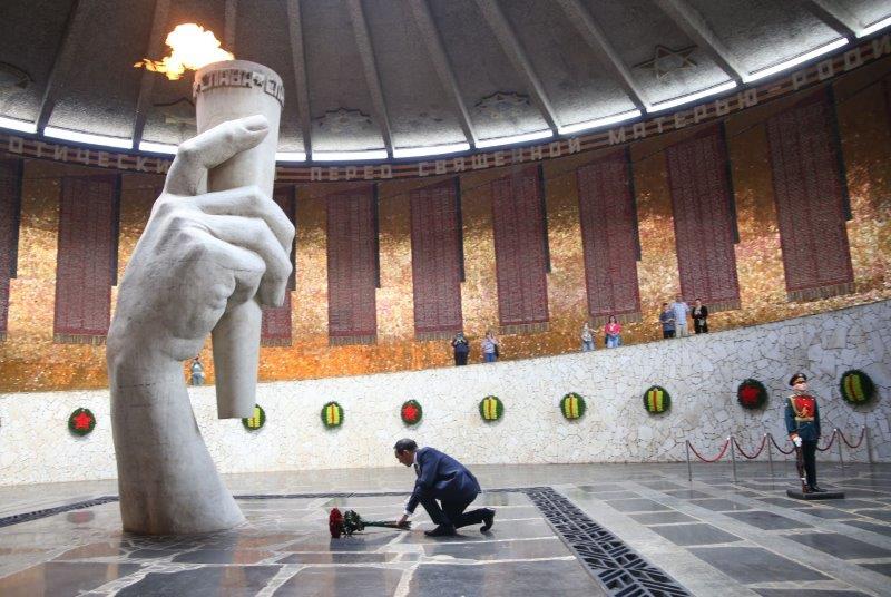Перед открытием знака участники возложили цветы к Вечному огню в Зале Воинской славы, к могиле Маршала Советского Союза Василия Чуйкова и Братской могиле защитников Сталинграда.