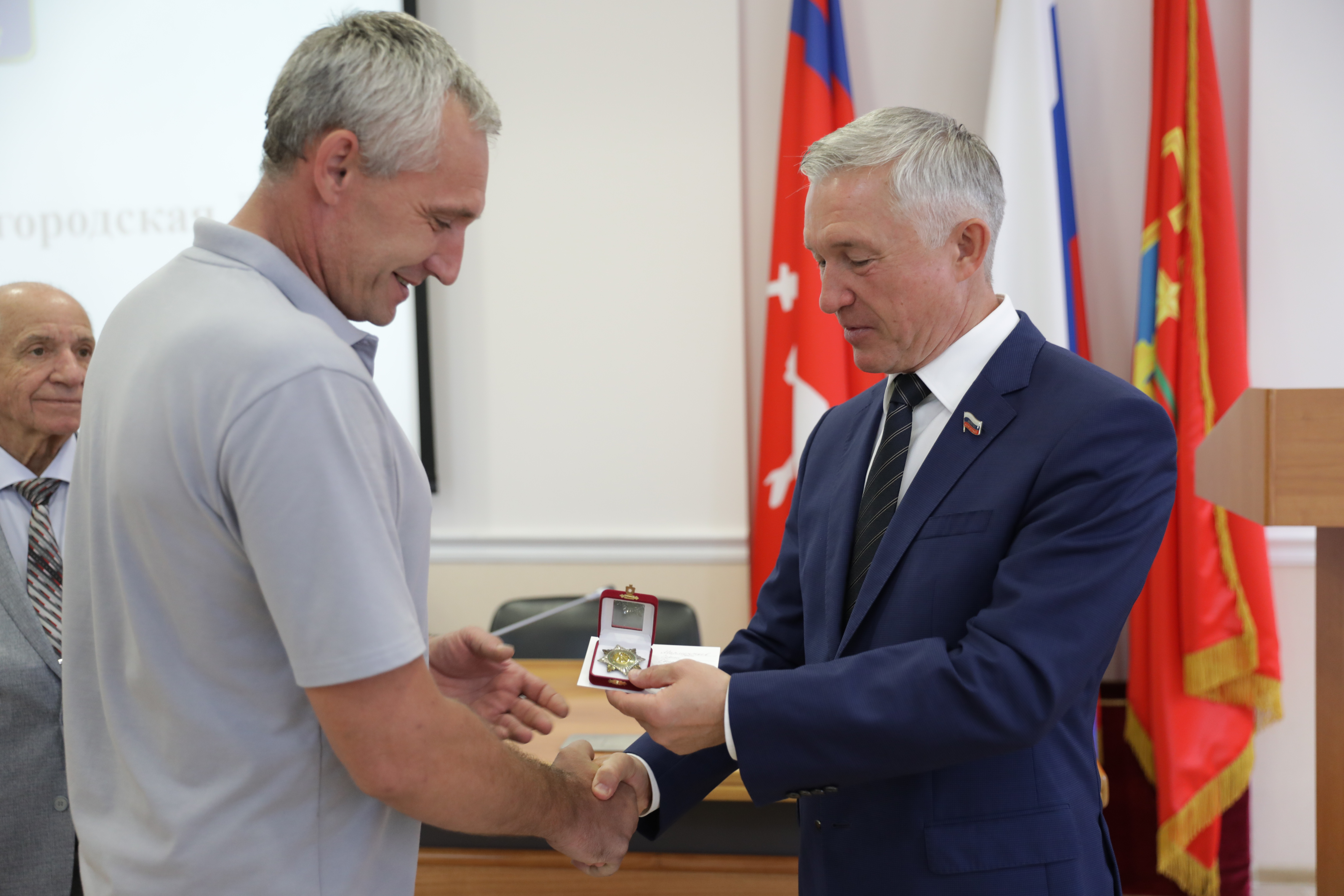 Напомним, в мае почетными знаками города-героя Волгограда «За верность Отечеству» были награждены представители ветеранского сообщества. Сегодня председатель городской Думы Владлен Колесников и руководитель городского совета ветеранов Александр Струков в присутствии всего депутатского корпуса городской Думы вручили высшие муниципальные награды: