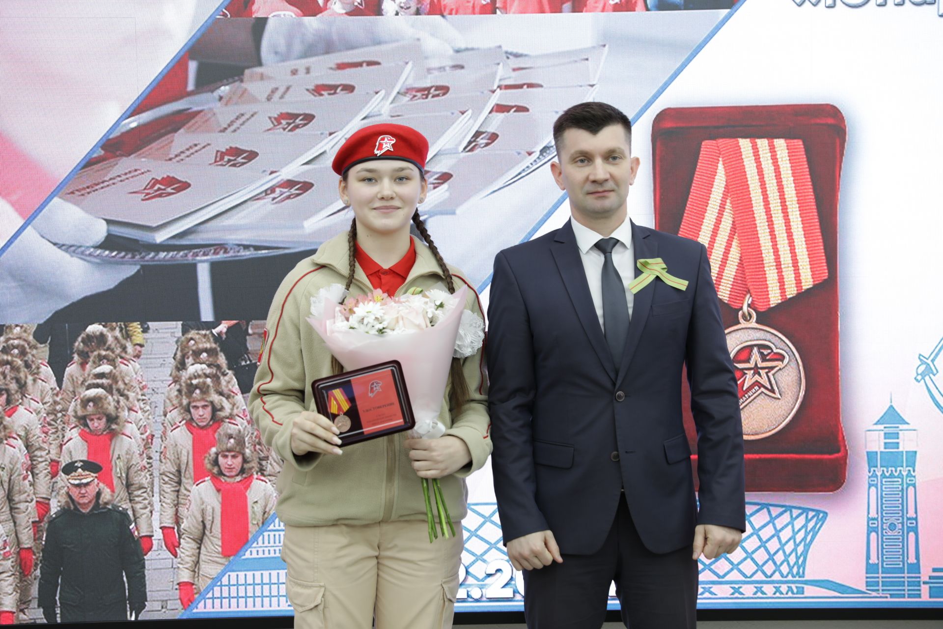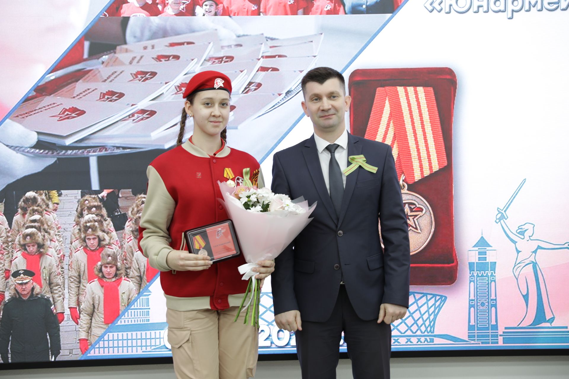 Геннадий Кузнецов поздравил всех собравшихся с 82-й годовщиной Сталинградской Победы и вручил знаки «Юнармейская доблесть III степени» учащейся школы №92 Краснооктябрьского района Анне Черной и ученице 54-й школы Советского района Дарье Рапота.