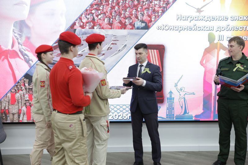Осенью 2024 года к знакам «Юнармейская доблесть III степени» были представлены пятеро лучших представителей Движения города-героя Волгограда. Сегодня знаки «Юнармейская доблесть III степени» вручили школьникам, трое из которых – ученики школы №54 Советского района.