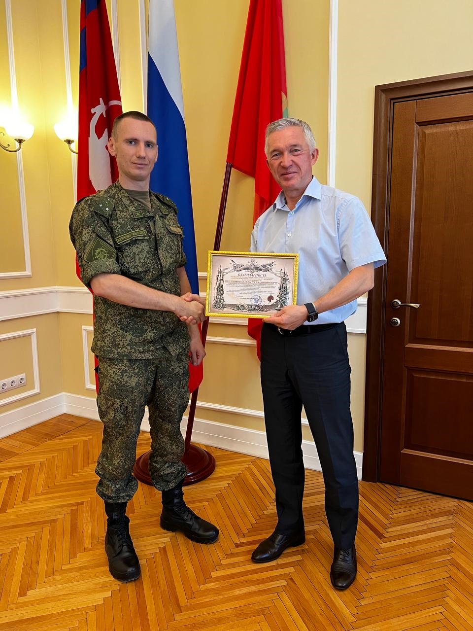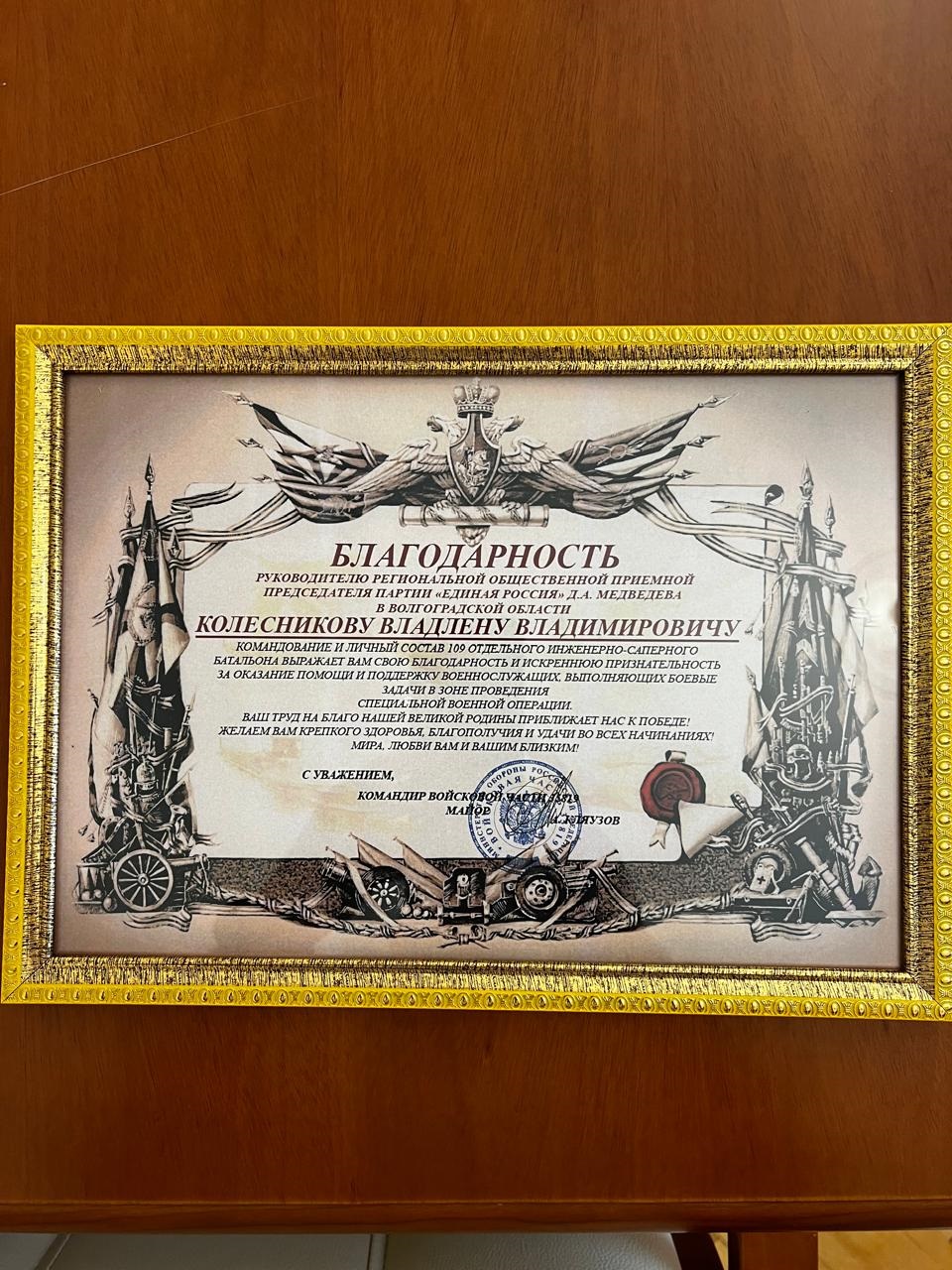Председателю Волгоградской городской Думы Владлену Колесникову в очередной раз вручена благодарность от командования и личного состава 109-го отдельного инженерного саперного батальона 20-й гвардейской мотострелковой дивизии за оказание помощи и поддержку военнослужащих, выполняющих боевые задачи в зоне проведения специальной военной операции.